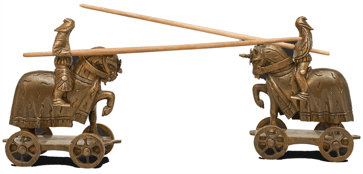 Ribbons or a piece of string could be threaded into their bases, allowing the players to pull the knights towards each other. If the lance of one hit his opponent, the latter was unhorsed.