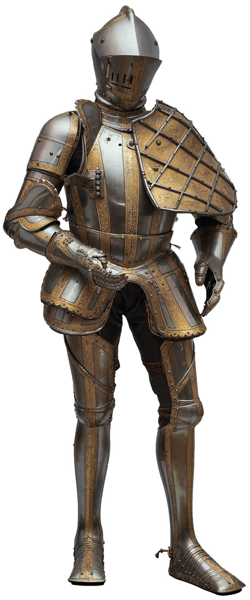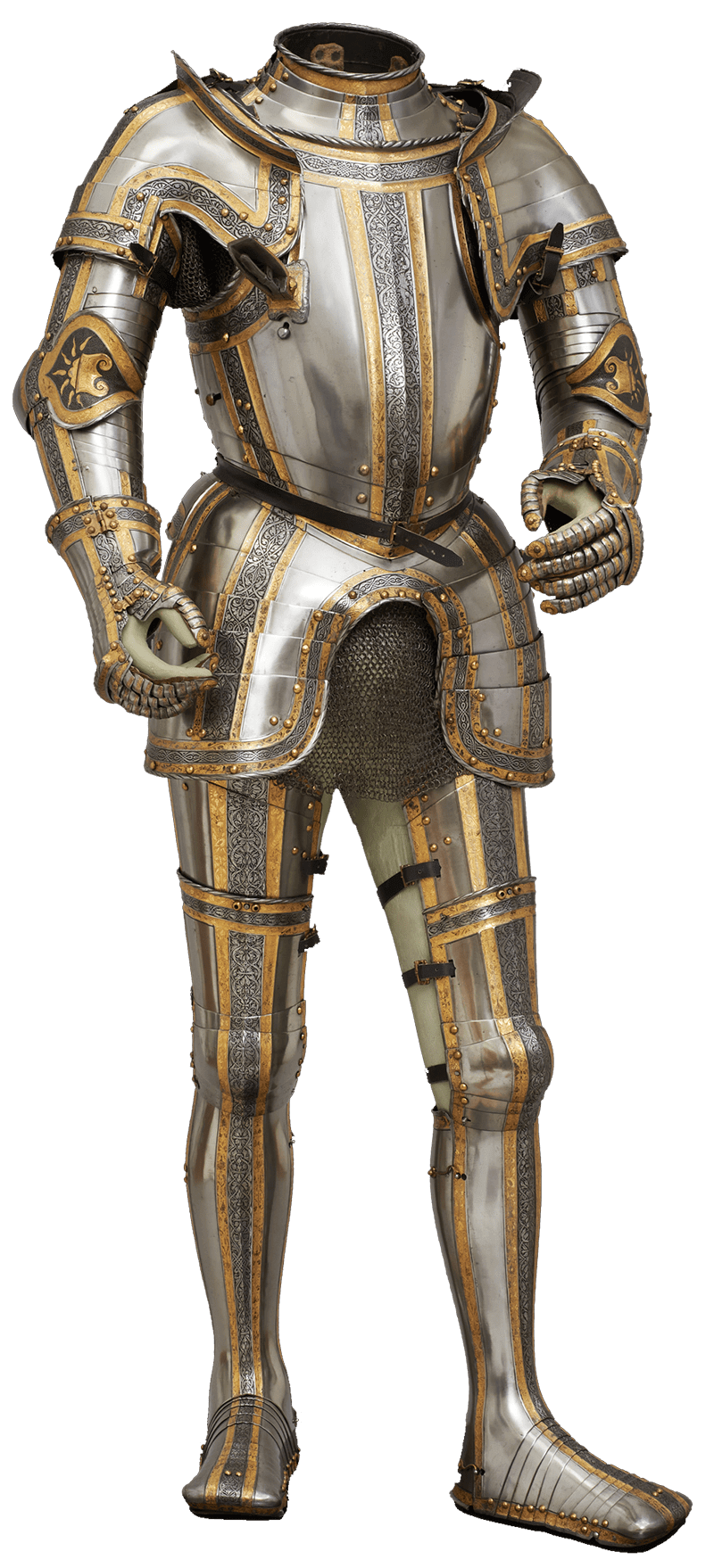 instead, armourers began to decorate contemporary harnesses with classical motifs. They illustrated, for example, the heroic exploits of Hercules or grotesque ornaments in highly-detailed repoussé work or gold and silver inlays.