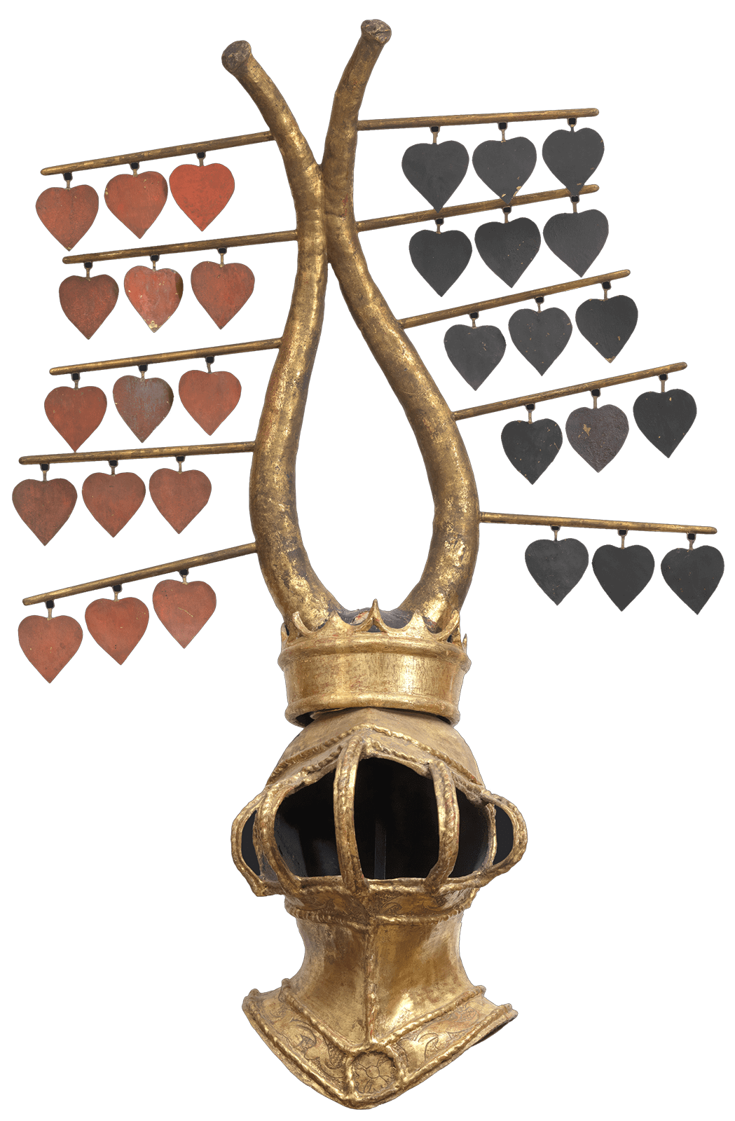 Iron, embossed, blackened, fire-gilt, fire-silvered, painted; brass; leather; textile